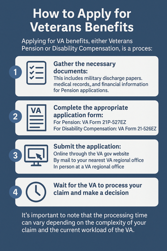 Applying for VA benefits, either Veterans’ Pension or Disability Compensation, is a process: